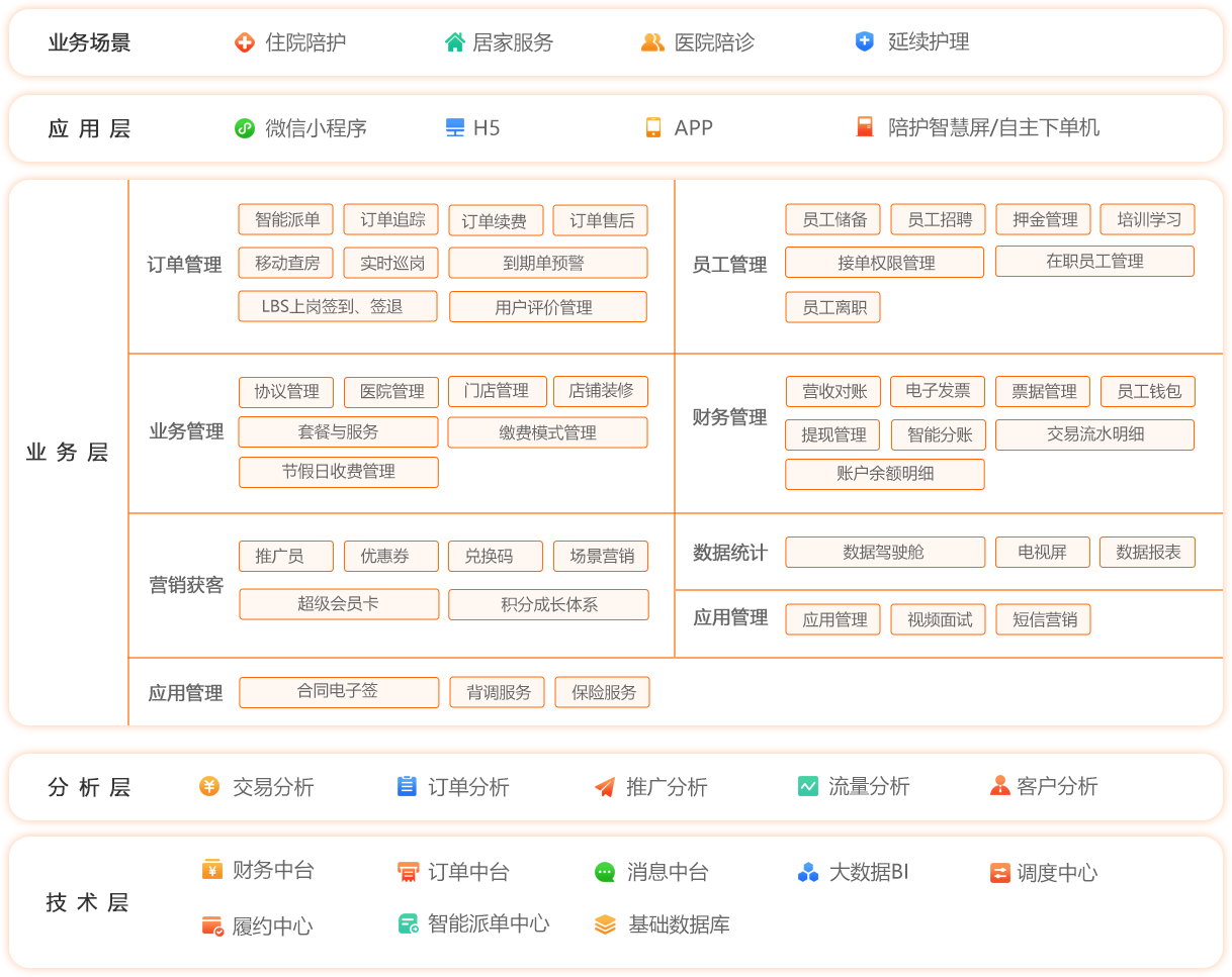 以信息技術為驅動,通過科技創新為智慧陪護行業進行聚合和賦能,打造開放的智慧陪護服務產業生態。為住院陪護、居家服務、醫院陪診、延續護理提供一站式解決方案。
